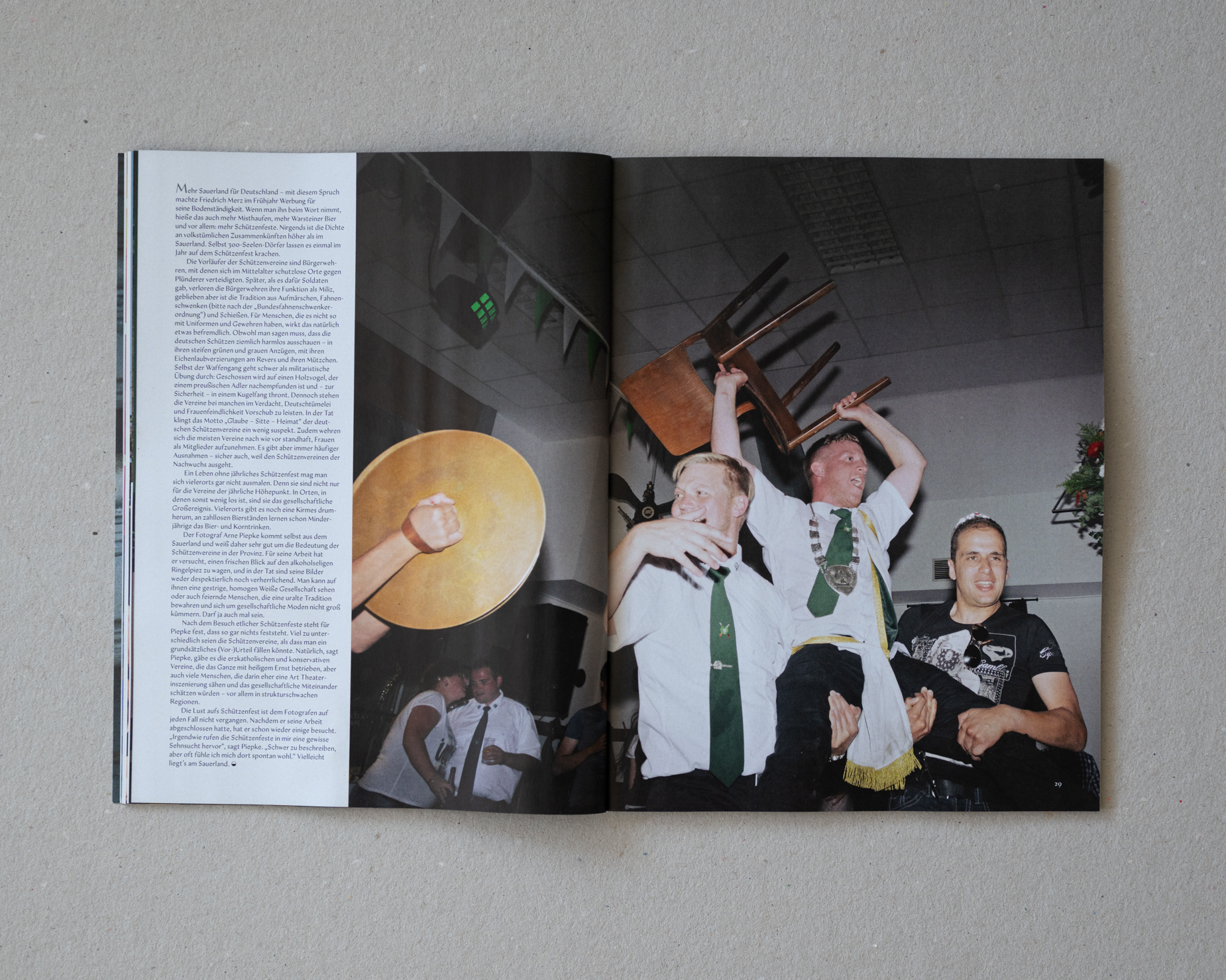 Arne gave a presentation about his work “Glaube, Sitte, Heimat” at the marksmen’s hall in Brunskappel. He invited different Clubs, which he had photographed over the years and talked about his workflow, his motivation and how his attituted and photographes developed throught the project.